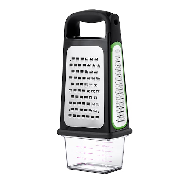 Det följer med en behållare med måttenheter och lock som både samlar upp den rivna maten, och kann förvara den