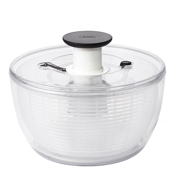 Den här salladsslungan är perfekt för att torka sallad, örter eller bär. Pumpmekanismen gör det enkelt att snurra salladen genom att trycka ned den mjuka knoppen till locket. Bromsknappen låter dig stoppa korgen från att snurra, och en halkfri ring under håller skålen på plats.