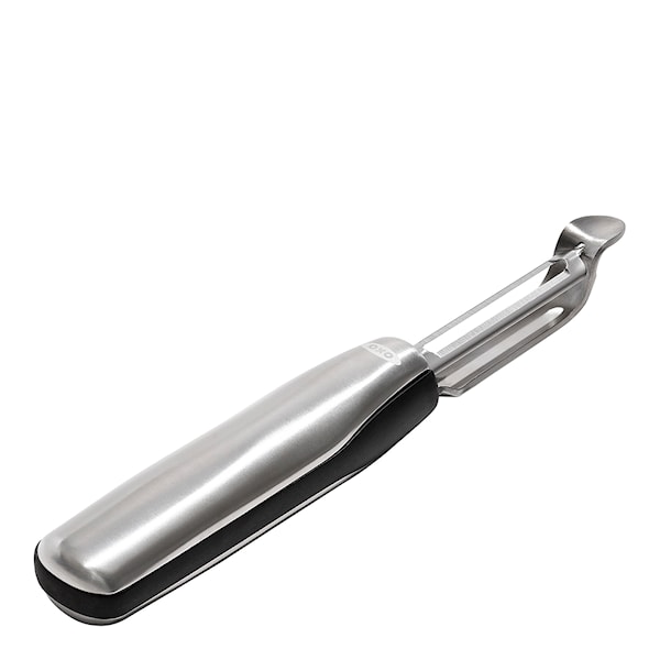 Oavsett om du ska skala en stor mängd äpplen eller flera kilo potatis kan potatisskalaren i stål från OXO klara uppgiften. Som ett av OXO:s mest ikoniska verktyg har skalaren ett vasst blad i japanskt rostfrit stål, som kan vridas för att glida lätt runt fasta frukter och grönsaker. Bladet glider lätt under skalaren och håller samtidigt de goda sakerna det ska skala hela. Skalaren har en inbyggd borttagare av potatisögon, som snabbt kan ta bort defekter i ett enda tag. Den slanka klassiska designen ger den ett professionellt utseende, samtidigt som skalaren har ett behagligt halkfritt grepp.