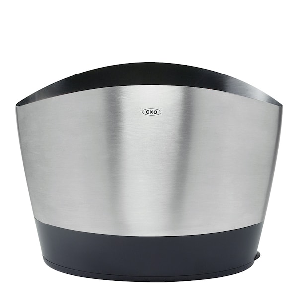 Den platsbesparande redskapshållaren från OXO i rostfritt stål, med måtten 12x21,5 cm, är perfekt för alla köksmiljöer. Hållaren har en ellipsform som gör det möjligt att placera den nära väggen eller i trånga utrymmen, vilket är praktiskt för mindre kök.