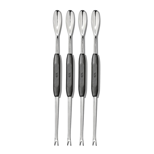 Skaldjursgafflar 4-pack är det perfekta verktyget för att njuta med lätthet och elegans. Det långa skaftet och böjda skeden gör dem idealiska för att nå långt in och få ut maximalt av krabbklor, hummerkött och andra delikatesser från havet. Gafflarna är designade i högkvalitativt rostfritt stål och med halkfritt grepp. Använd gärna för att njuta av andra delikatesser som oliver eller pickles.