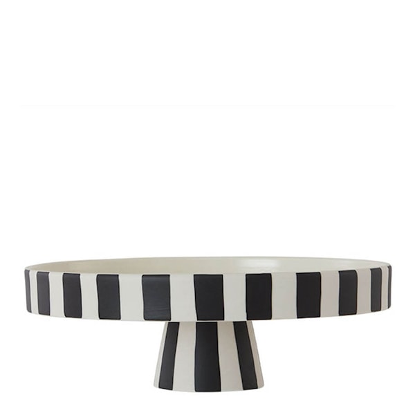 OYOY LIVING Toppu serveringsfat 27 cm vit/svart är en serveringsbricka på fot i 100% stengods, formgiven med Toppu-seriens grafiska uttryck. Den svartvita färgsättningen ger ett strukturerat och balanserat helhetsintryck.