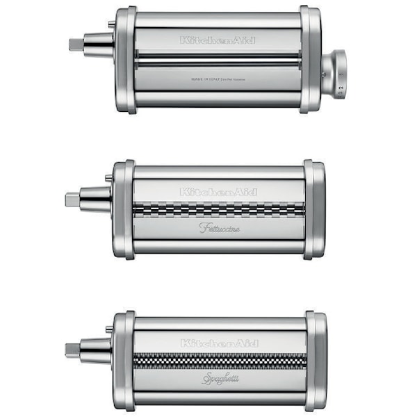 Set med pastavalsar till KitchenAids alla köksmaskiner, så att du kan laga egen färsk pasta från grunden. Gör det enkelt att rulla ut och skära till pastadegen.