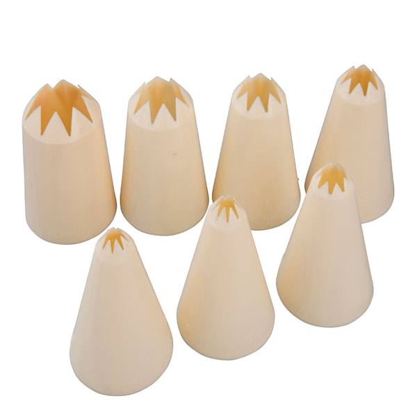 Detta tyllset från Patisse innehåller sju stjärntyllar i krämfärgad plast, speciellt utformade för att dekorera tårtor, cupcakes och desserter. Tyllarna skapar olika mönster och texturer och passar de flesta standardspritsar.