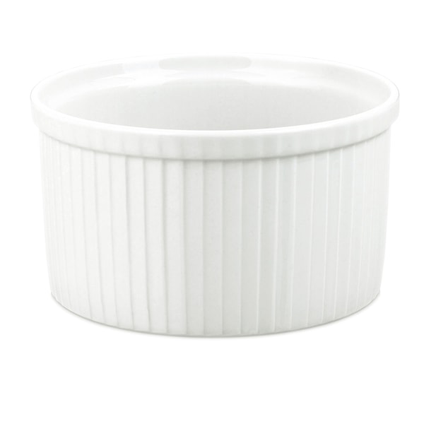 Vacker suffleform i vitt tåligt porslin. Perfekt för suffleerna till festen, årsdagen och årets alla dagar. Den vita blanda utan gör sig fint till en nygräddad luftig suffle.