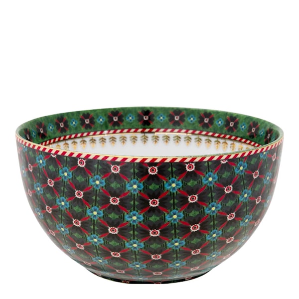 Mönstret kombinerar grönt kakeltryck med röda accenter och en guldkant, inspirerat av klassiska vintertextilier. Skålens storlek gör den mångsidig – samtidigt som designen lyfter varje måltid.
