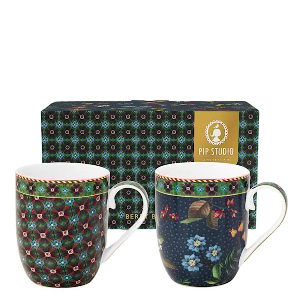 Pip Studio Berry Blues liten mugg 2-pack 20 cl blå kombinerar vinterns färger och former i ett stämningsfullt porslinsset. Med mörkblå botten, blommotiv, bär och vackra dekorativa inslag i rött, grönt och guld, ger dessa muggar en känsla av vintervärme. Perfekta för kaffe eller te – och en självklar presentidé.