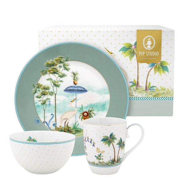 Pip Studio Jolie frukostset 3 delar blå är en färgstark start på dagen. I setet ingår en tallrik, skål och kopp – alla i porslin och prydda med exotiska motiv, där varje detalj är noggrant placerad för att skapa en 360-graders designupplevelse.