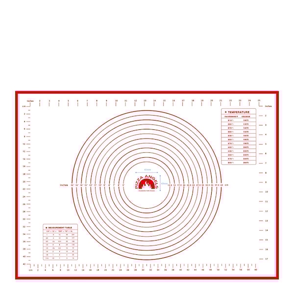 Bakmattan i silikon ligger stadigt på bänken och ger dig ett perfekt underlag för att knåda ut pizzabottnar, kavla deg eller förbereda annan bakning. Den smarta måttguiden på mattan hjälper dig att få rätt storlek på degen varje gång, oavsett om du bakar pizza, bröd eller kakor.