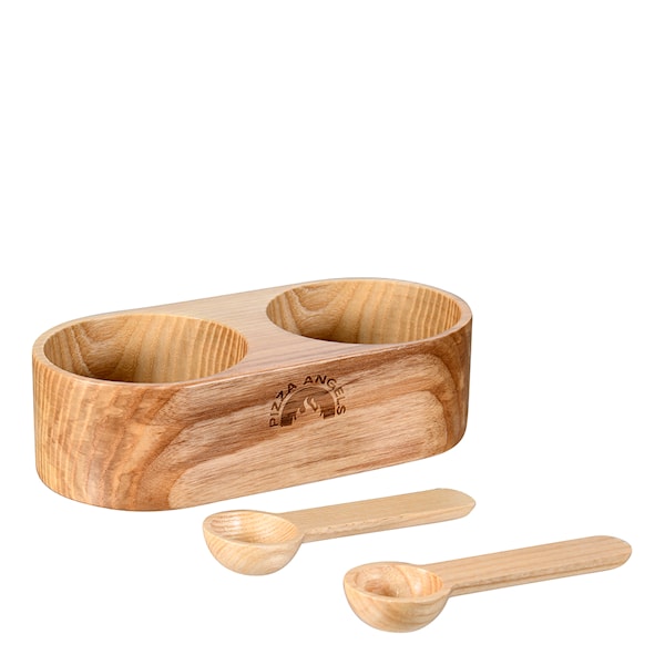Kryddburk i askträ som mäter 12,5x7,5x4,5 med två medföljande skedar från Modern Houses Pizza Angels-serie.
