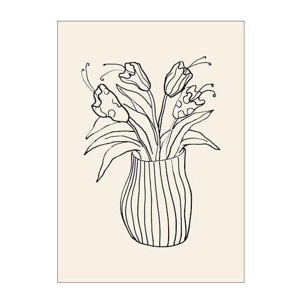 Affordable Art Prints poster 50x70 cm Vase Sketch från Poster & Frame är en elegant och minimalistisk representation av en blomsterbukett i en randig vas. Med en krämigt rosa-vit bakgrund framhäver de svarta streckteckningarna på ett subtilt sätt blommornas skönhet och essens. Denna poster, med sin neutrala färgpalett och delikata linjearbete, fångar blommors och växters naturliga skönhet på ett förenklat och konstnärligt vis. Poster & Frame's unika konstnärssamarbete ger dig möjlighet att välja bland en mångfald av vackra, tuffa, roliga, färgglada och spännande motiv. Affischerna trycks på högkvalitativt 230 grams papper med Ultra Coating, vilket säkerställer att de håller sig vackra och levande i generationer.