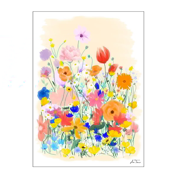 Anna Thomsen poster 50x70 cm Field of Flowers No1 från Poster & Frame är ett digitalt konstverk som tar inspiration från traditionella medier och utforskar hur de kan förändras när de används digitalt. Detta verk är en del av en serie målningar som skildrar fantasifulla blomsterfält.