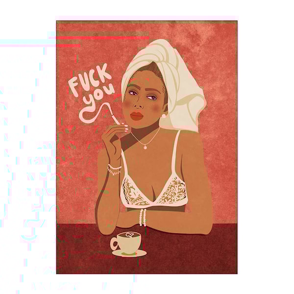 Raissa Oltmanns-poster 30x40 cm Fuck You från Poster & Frame är ett kraftfullt och färgstarkt konstverk som fångar både ögat och sinnet. Raissa Oltmanns, en illustratör och designer från Hamburg, Tyskland, är känd för sin detaljerade stil och rika färgpalett. Hennes konstverk hämtar inspiration från naturen, djurvärlden och mänsklig skönhet, och fokuserar på feminism genom att utmana konventionella kvinnoroller och hylla starka, självmedvetna karaktärer.