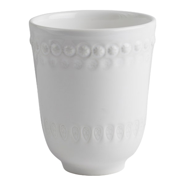 Bjud till bords med rustika och reliefmönstrade serien Daisy där denna vackra mugg ingår. Så söt med mönster i form av små blommor runt kanten längst upp och bladmönster runt nederkanten. Skön att dricka både kaffe och te ur, eller vad för dryck som önskas. Håller drycken fortsatt varm tack vare tjockleken på lergodset. Mycket fin även att använda till annat, som en liten vas eller hållare till pennor eller kanske salta pinnar. Den rymmer 35 centiliter och finns att tillgå i många härliga färger, bara att välja just din favorit.