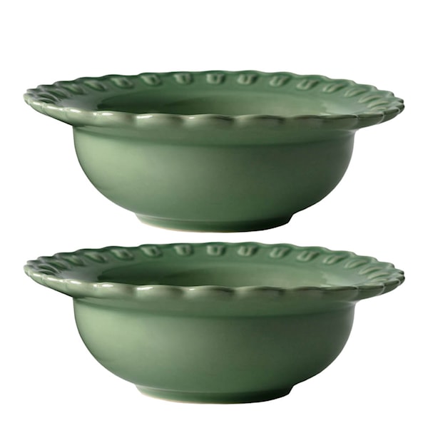 Tulipa djup tallrik på 17 cm i 2-pack från PotteryJo, är en liten och charmig skålformad tallrik med vågig kant och tulpanrelief. Den är handgjord i Portugal och passar perfekt till små rätter, förrätter eller efterrätter.