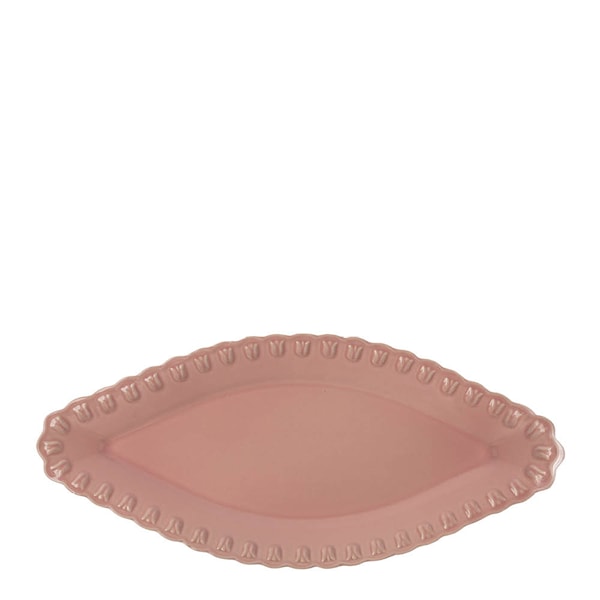 PotteryJo TULIPA ovalt fat, 42 cm, är handgjort i Portugal och har en elegant kant dekorerad med tulpanmönster. Det rustika och konstnärliga uttrycket ger ett unikt inslag på bordet.