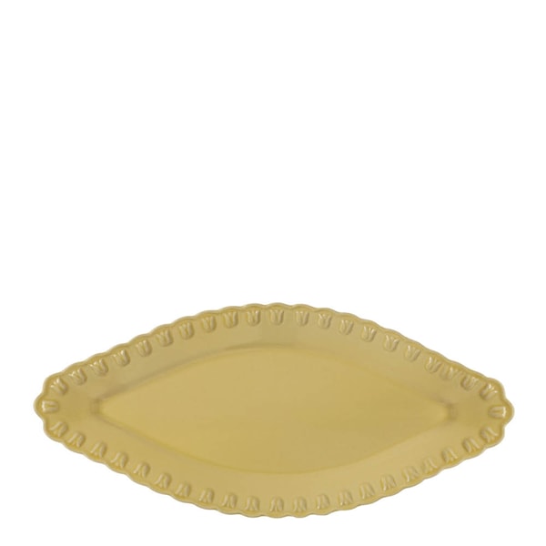 Upptäck PotteryJo TULIPA ovalt fat 42 cm – ett generöst serveringsfat med dekorativ vågkant och subtilt tulpanmönster i relief.