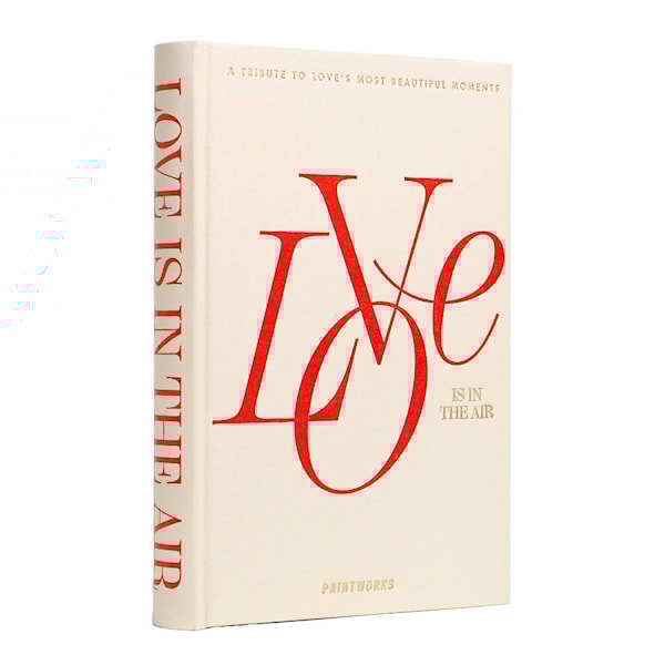 Fira kärleken med Love is in the Air fotobok från Printworks – ett elegant album i beige tyg med röd text som säger allt.