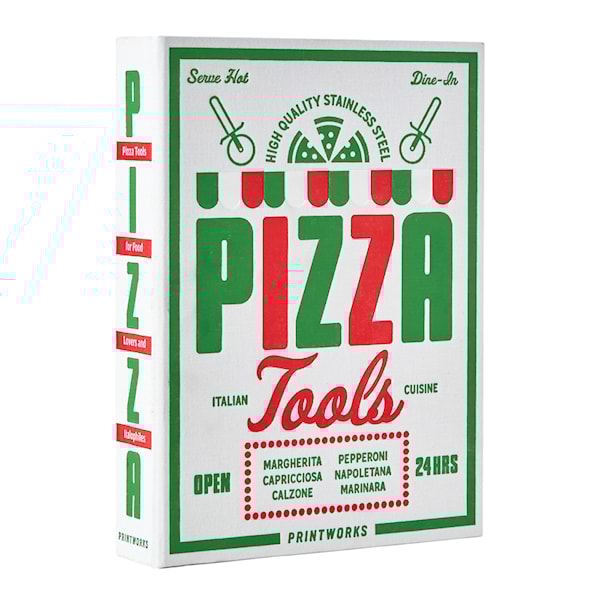 Essentials pizzaset från Printworks. Setet är elegant designat och presenterat i en stilren bokliknande låda, perfekt för att dölja verktygen på ett diskret och smakfullt sätt. När lådan öppnas hittar du allt som behövs för en lyckad pizzafest.