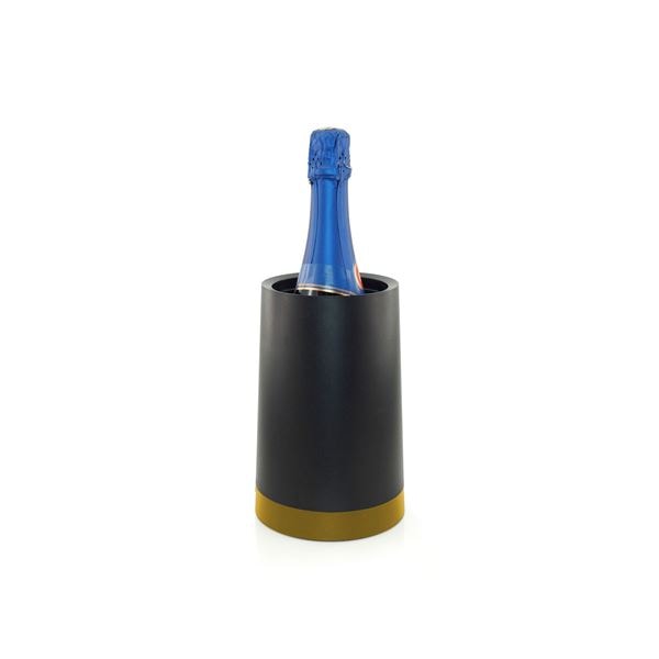Stilren vinkylare med guldig kant från Pulltex. Kylaren har ett löstagbart kylsystem med gel som kyls och placeras i behållaren för att hålla flaskor kalla. Passar för både vin och mousserande. Finns både i Svart och Vitt.