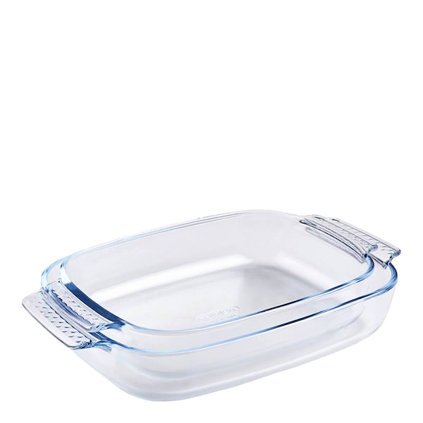 Ugnsfast set från Pyrex med två rektangulära formar i klart, reptåligt glas – i storlekarna 30 × 20 × 6 cm och 35 × 23 × 6 cm. Formarna tål temperaturer från -40 °C till 300 °C och kan användas i både ugn, mikrovågsugn och frys.
