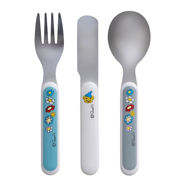 Bamse barnbestick från Rätt Start är ett slitstarkt bestickset anpassat för små händer. Setet består av en kniv, gaffel och sked, där handtagen är tillverkade av ABS-plast för ett bra grepp, medan bestickdelarna är i rostfritt stål för hållbarhet.
