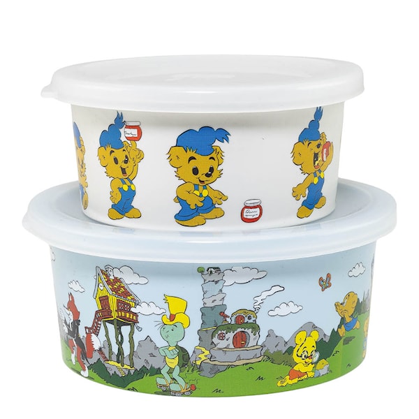Bamse förvaringslådor i 2-pack från Rätt Start är ett praktiskt set med plastburkar i två olika storlekar och med olika Bamsemotiv, perfekt för snacks, frukt eller mindre måltider. Den lilla lådan rymmer 250 ml, medan den större har en kapacitet på 450 ml.
