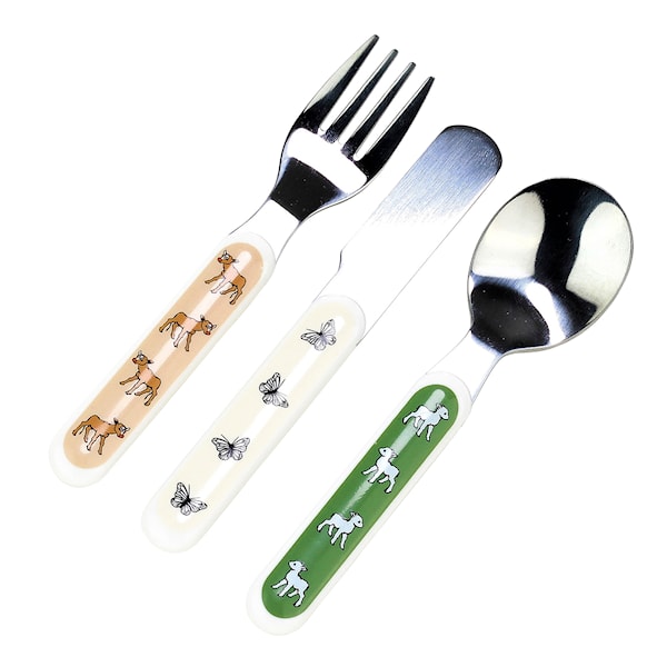 Barnen i Bullerbyn barnbestick 3 delar från Rätt Srart. Gör måltiderna både trygga och lustfyllda med barnbestick från Rätt Start. Setet innehåller tre delar – kniv, gaffel och sked – i rostfritt stål och ABS-plast, särskilt anpassade för små händer.