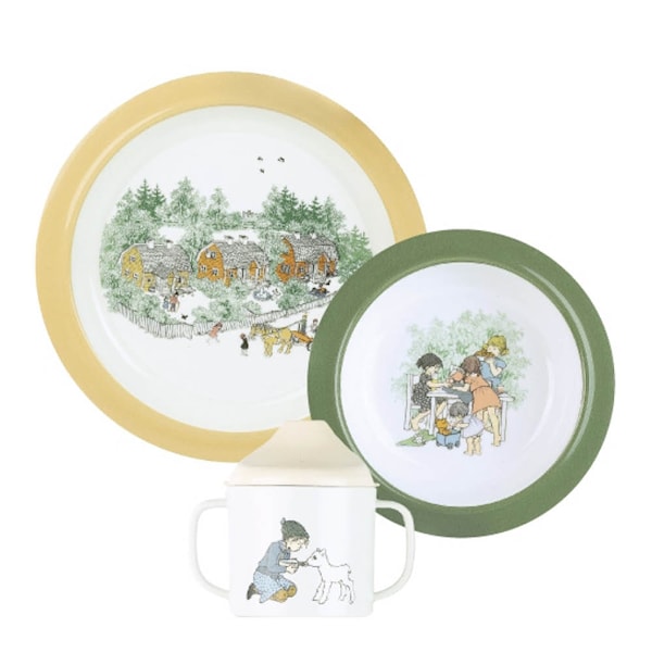 Alla delar är tillverkade i slitstarkt RPET som tål maskindisk, men bör inte användas i mikrovågsugn. Med nostalgiska illustrationer från Astrid Lindgrens Barnen i Bullerbyn kombineras funktion med ett varmt, klassiskt uttryck.