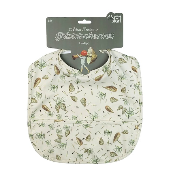 Rätt Start Elsa Beskow haklapp Tomtebobarnen kombinerar praktisk funktion med ett lekfullt uttryck. Den är tillverkad i mjuk polyester med vattenavvisande PU-behandling och har en bred ficka framtill som fångar upp matspill.