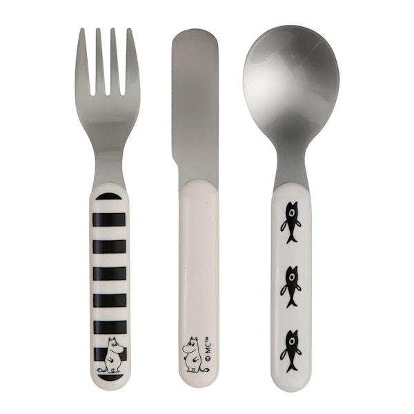 Mumin barnbestick Vatten & Bad från Rätt Start är ett slitstarkt bestickset designat för små händer. Setet innehåller en kniv, gaffel och sked med handtag i ABS-plast för ett bra grepp, medan bestickdelarna är tillverkade av rostfritt stål för hållbarhet.