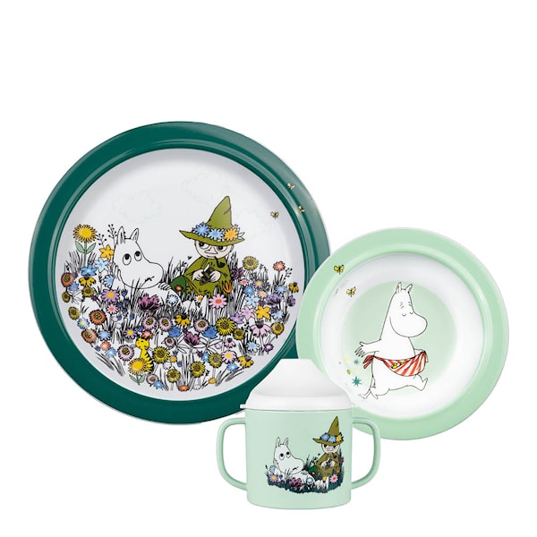 Servisen är tillverkad i slitstarkt RPET och tål maskindisk. De mjuka och fantasifulla illustrationerna från Mumindalen gör måltiden till en mysig stund för både barn och vuxna.
