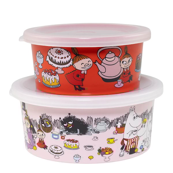 Mumin förvaringslådor i 2-pack från Rätt Start är ett praktiskt set med plastburkar i två olika storlekar och med olika Muminmotiv, perfekt för snacks, frukt eller mindre måltider. Den lilla lådan rymmer 250 ml, medan den större har en kapacitet på 450 ml.