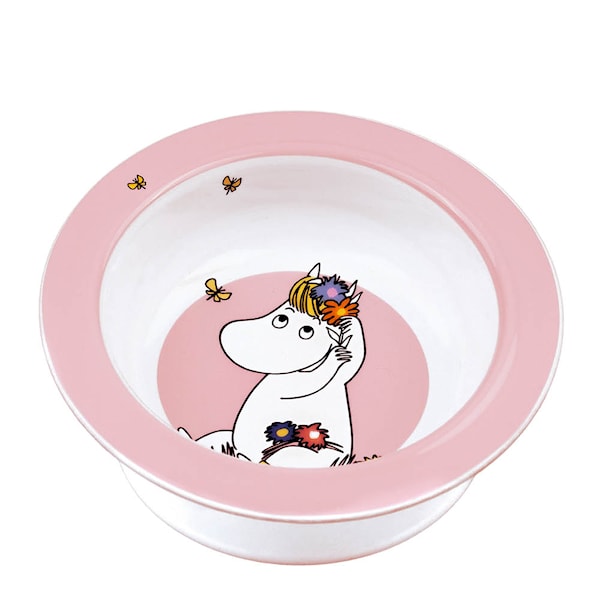 Rätt Start Mumin tallrik med sugfot 15,5 cm Äng rosa är en barntallrik med motiv från Mumin. Den är utvecklad för att ge bättre stabilitet under måltider.