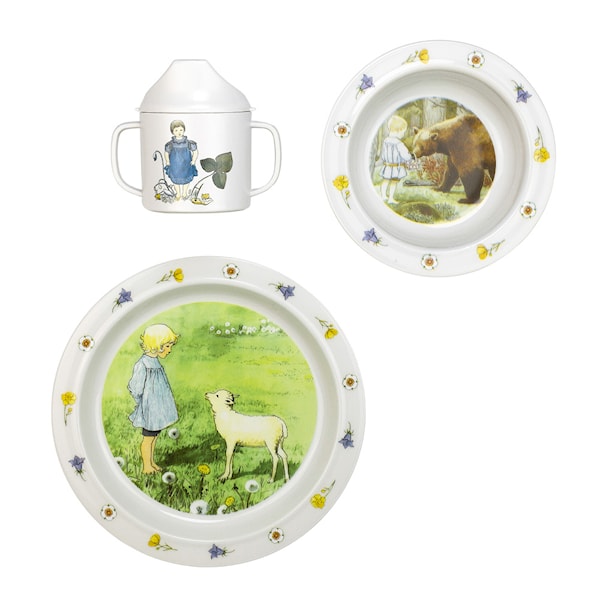 Elsa Beskow barnservis från Rätt Start är ett praktiskt set i tre delar med klassiska motiv från Elsa Beskows sagor, perfekt för de minsta. Setet innehåller en pipmugg med två handtag som ger ett bra grepp. Locket sitter säkert på plats med hjälp av en silikonring, och i pipen sitter ett spillstopp som begränsar vätskeflödet. När barnet blir större kan ventilen enkelt tas bort för friare drickande.