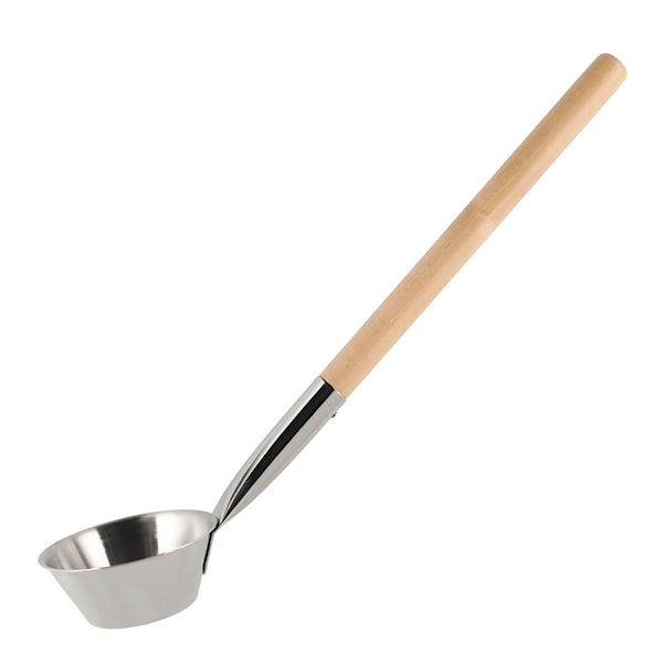 Skopan är tillverkad av blankt rostfritt stål och har handtag i björk. Längden på 50,5 cm ger god räckvidd och säker hantering i bastun.