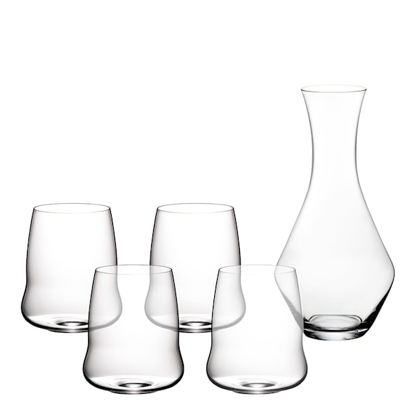 Set med fyra druvspecifika vinglas med tillhörande karaff från Riedel. Serien Stemless Wings är Riedels glasserie utan stam, med bred botten vingformad kurva på kupan. Glasen är perfekta för fylliga, komplexa röda viner med mycket tanniner. Glaset låter bouqueten utvecklas och rundar av skarpa toner. Det betonar fruktigheten, drar ner bitterheten i tanninerna och låter vinet balanseras.