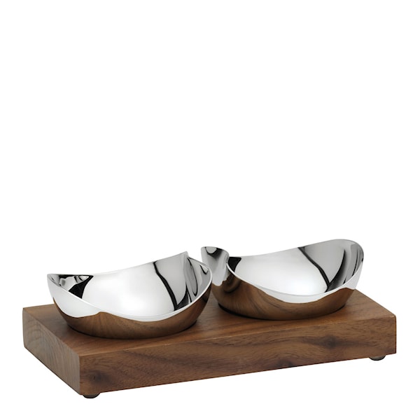 Två eleganta skålar i blankpolerat stål med en tillhörande träbricka i valnöt