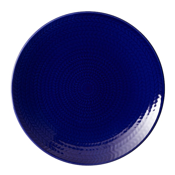 Rörstrand Blå Eld tallrik 19 cm blå är en assiett i fältspatporslin från den klassiska servisen Blå Eld, formgiven av Hertha Bengtson 1951. Serien producerades ursprungligen mellan 1951 och 1971 och relanseras nu i samband med Rörstrands 300-årsjubileum. Den djupblå glasyren och den karakteristiska fiskbensreliefen ger tallriken ett grafiskt uttryck där glasyrens djup och struktur framträder tydligt.