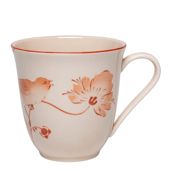 Rörstrand Fågel mugg 30 cl Jubilee är en del av Rörstrands 300-årsjubileum – en kollektion som hyllar svensk designtradition med moderna inslag. Den handmålade dekoren av fåglar och blommor är inspirerad av mönster från 1700-talet, och den karamellfärgade glaseringen ger ett varmt och tidlöst uttryck.