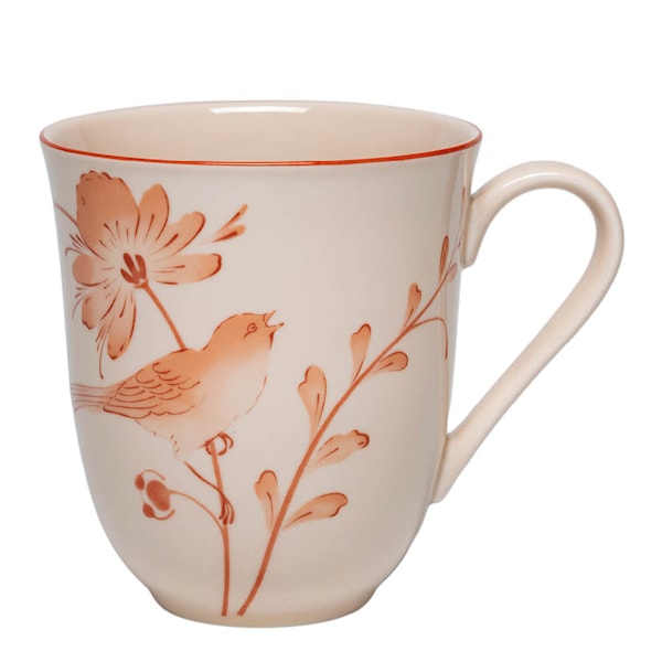 Rörstrand Fågel mugg 50 cl Jubilee är en stor och bekväm mugg med ett formspråk som bär 300 års designarv. Den handmålade dekoren med fåglar och blommor är inspirerad av 1700-talets mönster i Rörstrands arkiv, och den karamellfärgade glaseringen ger ett varmt intryck.