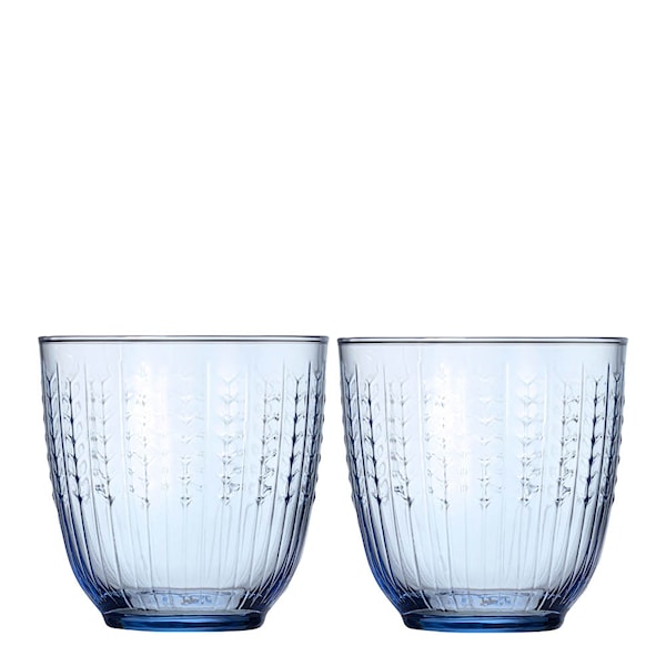 Rörstrand Swedish Grace glas 25 cl 2-pack Jubileum blå är ett set med två dricksglas i munblåst glas inspirerade av Louise Adelborgs ikoniska Swedish Grace-servis från 1930. Glasen lanseras i samband med Rörstrands 300-årsjubileum och markerar första gången det klassiska veteaxmönstret tolkas i glas. Den räfflade strukturen skapar ett elegant ljusspel i den blå tonen och ger glasen ett distinkt uttryck.
