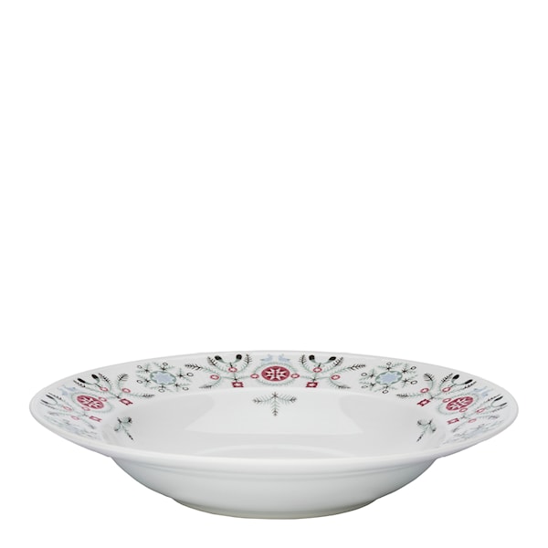 Swedish Grace Winter djupa tallrik, 25 cm, från Rörstrand är prydd med stiliga granar, frostiga mistlar och förtjusande snöflingor. Designad av Katarina Brieditis med en modern tolkning av Louise Adelborgs Swedish Grace, tallriken förmedlar julens magi och elegans till din matupplevelse – idealisk för mysiga julstunder.