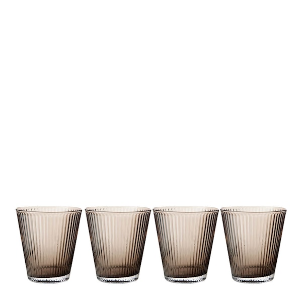De många räfflorna är inte bara dekorativa utan bidrar också till ett förbättrat grepp, samtidigt som glasens form är anpassad för att staplas. Glaset har en valnötsfärgad ton, rymmer 26 cl och är godkänt för maskindisk upp till 55 grader. Precis som tidigare kombineras estetik med praktisk användning – ett signum för Rosendahls formgivning.