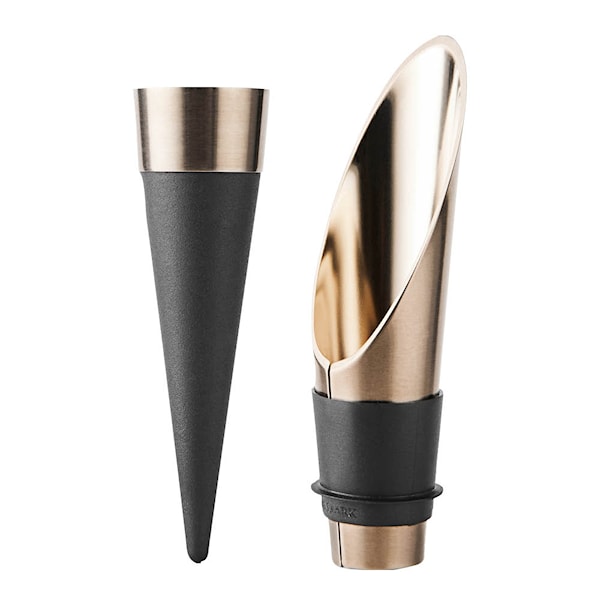I likhet med sin 30 år gamla föregångare är vinkorken 2023 designad som en avlång kon i mjukt, svart silikonliknande material. Rosendahl har inte ändrat formen, det som är nytt är det patinerade stålet på toppen av korken - en modern uppdatering.
