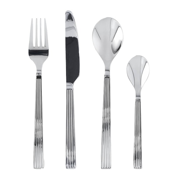 Setet innehåller fyra knivar, gafflar, matskedar och teskedar – perfekt avstämda för att komplettera Grand Cru-serien i vitt, Cottage eller färg. Den blanka finishen och det strömlinjeformade uttrycket tillför dukningen en ny nivå av elegans. Subtilt men effektfullt – precis som du vill ha det.