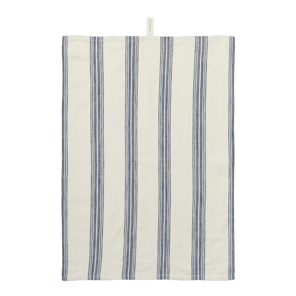 Denna kökshandduk mäter 50x70 cm och är vävd med ränder i varierande bredd som sammanfogas som två banor i kökshanddukens längd i säsongens mörkblå färgnyans. Ränderna står i vacker kontrast till grundfärgen i sand som bidrar till ett lugnt och jordnära uttryck. Handduken är tillverkad i en blandning av återvunnen GRS-certifierad bomull och återvunnen GRS-certifierad polyester, vilket garanterar en socialt och miljömässigt ansvarsfull produktion.