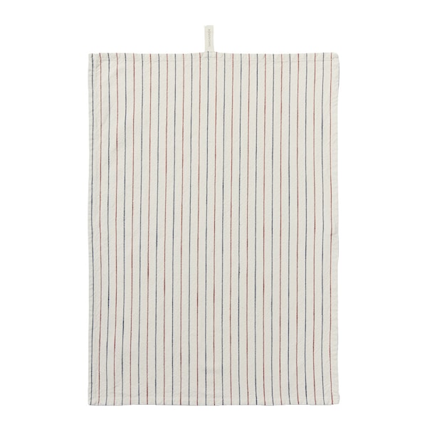 Denna kökshandduk mäter 50x70 cm och är vävd med smala ränder i säsongens blå och terrakottafärgade nyanser. Ränderna står i vacker kontrast till grundfärgen i sand som bidrar till ett lugnt och jordnära uttryck. Handduken är tillverkad i en blandning av återvunnen GRS-certifierad bomull och återvunnen GRS-certifierad polyester, vilket garanterar en socialt och miljömässigt ansvarsfull produktion.