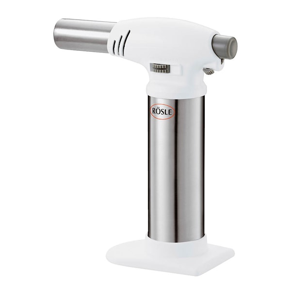 Gasbrännare från Rösle. Ett professionellt köksredskap som gör det lätt att få fin färg på créme brûlée, potatismos, maräng och annan matlagning där en krispigt gyllene yta önskas. Justerbar flamreglering upp till 1300 °C och du kan använda den i upp till 60 minuter. Fungerar även utmärkt att tända grillen, marschaller och öppna spisen med. Utrustad med barnsäkert reglage.