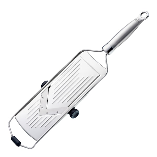 Mandolinjärn med V-skär, från tyska familjeföretaget Rösle. Det högkvalitativa rostfria handtaget är ergonomiskt format och passar därför perfekt i handen. Med denna mandolin skär långa, tunna strimlor av zucchini, morot, kål, potatis, äpplen och annat frukt och grönt med hjälp av ett rakbladsvasst blad i rostfritt stål. Till och med tomater kan du skära eftersom bladen är så vassa. Med reglage i sidorna kan du justera skivbredden upp till 5 mm. Det har ett glidsäkert stöd framtill så att rivjärnet står stadigt när det används. Rivjärnet kan också användas direkt ovanför en skål. Praktisk skyddskåpa ingår samt en hållare till grönsaken eller frukten, så att du inte skär dig. I änden finns en upphängningsögla, ifall du vill hänga upp järnet när det inte används.